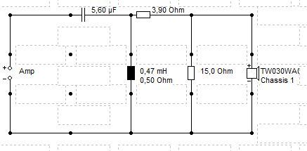 Als Vergleich ist zunächst ein einfacher Kondensator mit 13,6µF in Reihe geschaltet.(Ergebnis Onlinerechner mit angenommenen 4 Ohm laut Datenblatt).